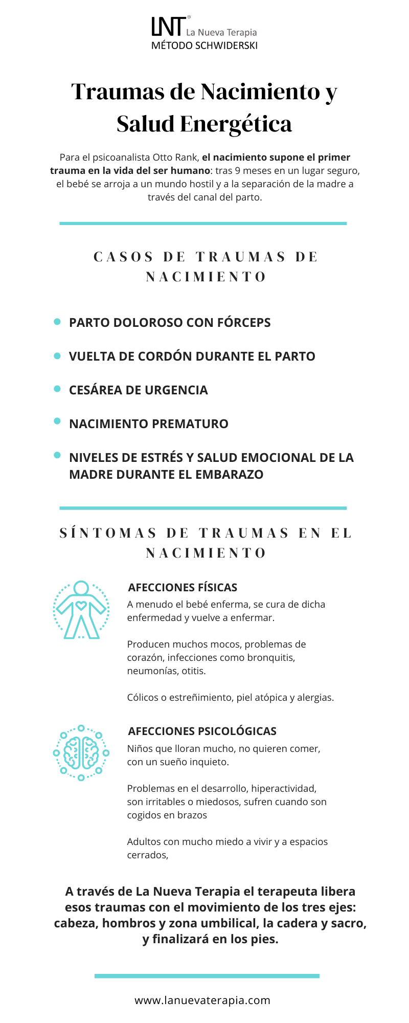 Desde un parto que se prolonga más horas de lo esperado, una cesárea de emergencia o una posición compleja del cuerpo del bebé, hasta un parto que se ajusta a lo planeado, los traumas del nacimiento se recogen en la teoría de que el nacimiento supone para el ser humano el primer trauma al nacer. Desde La Nueva Terapia le damos solución.